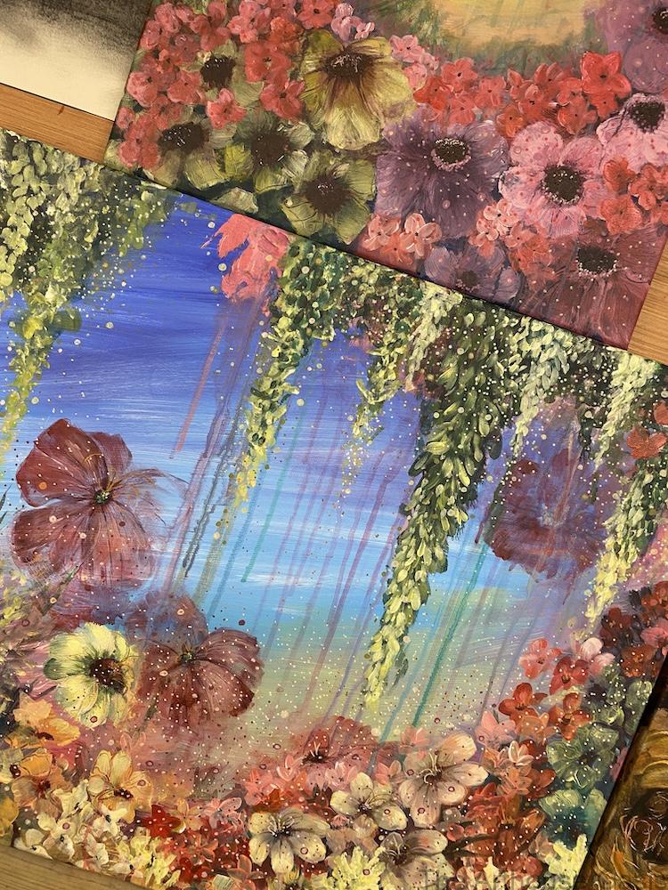 This week we are trying out new techniques and having fun layering colour and shape as these paintings take form.