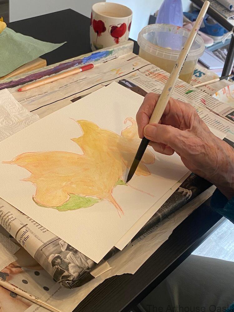 A truly special painting session with my oldest student, aged 99, exploring flowers and autumn leaves in watercolours. These paintings show how creativity has no age limit!