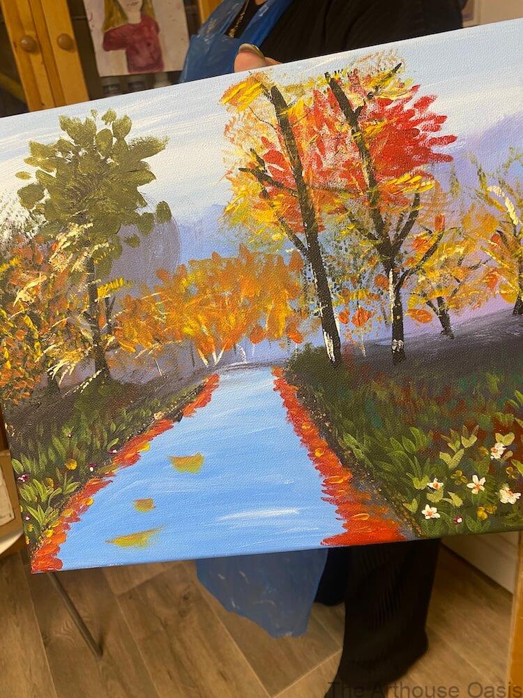 These autumn-inspired paintings explore colour, light and atmosphere using acrylics, with a focus on loose brushwork and confident layering. Students worked on capturing reflections, depth and seasonal warmth while learning how to simplify shapes and let colour do the storytelling. Each piece celebrates the joy of painting landscapes without overthinking.