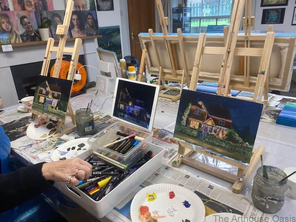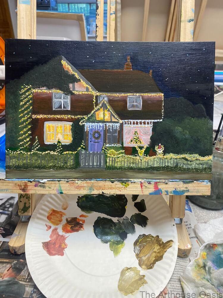 A really special, pre-christmas art session focused on turning a personal painting into Christmas cards for the family! Working in acrylics on board, the aim was to capture the feeling of our student’s family home at Christmas and create something meaningful to share with family.