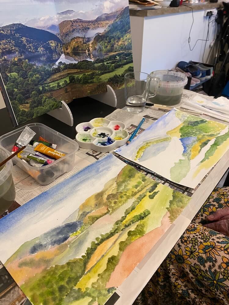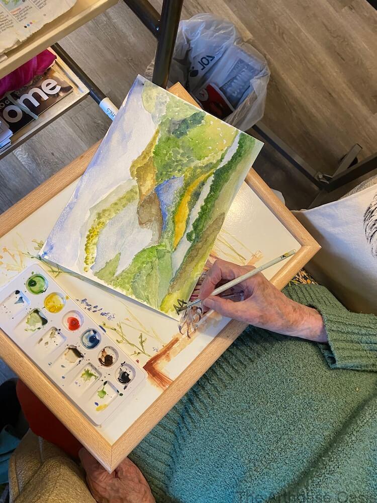 What painting at 99 years of age looks like! This one-to-one watercolour session took place in the comfort of my artist’s own home, making creativity accessible, calm, and enjoyable. Working at an unhurried pace we allowed space for confidence, expression, and the simple pleasure of painting!