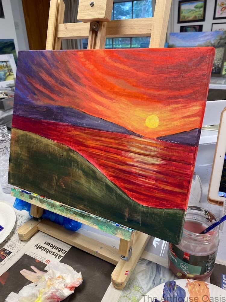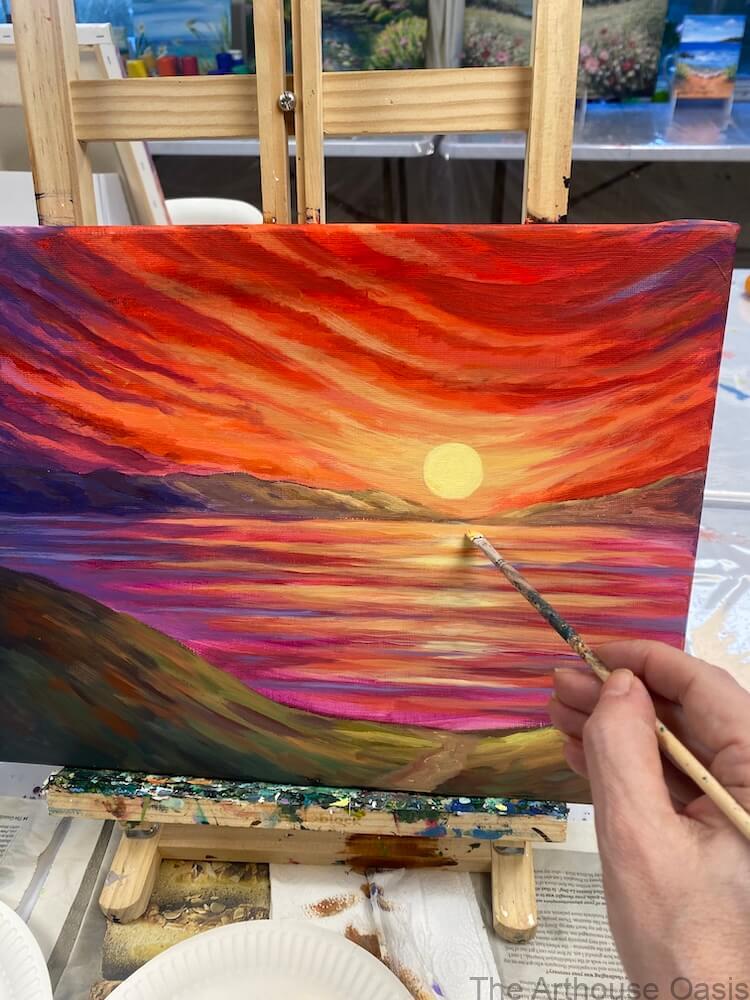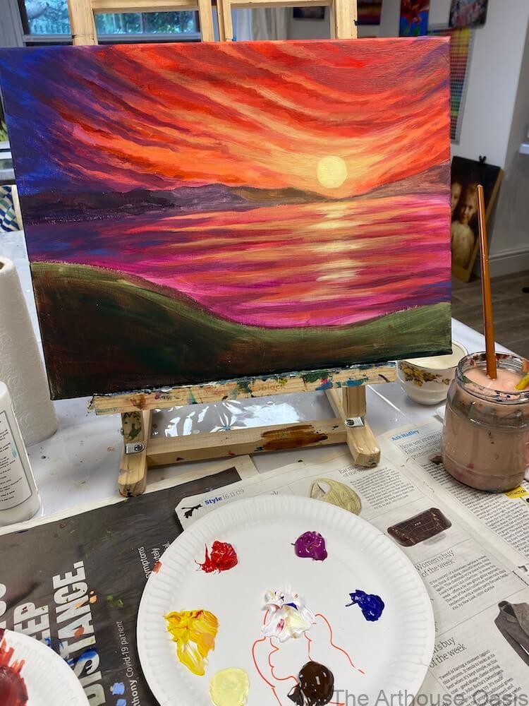 These sunset sessions are all about mastering gradients and learning how to blend colour smoothly to create that beautiful glow across the sky and water. From bold, vibrant tones to soft transitions and reflections, students build confidence with acrylic techniques while creating something really striking.