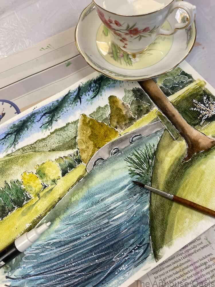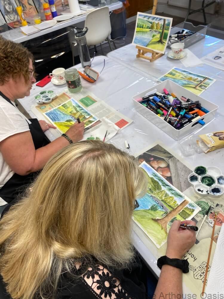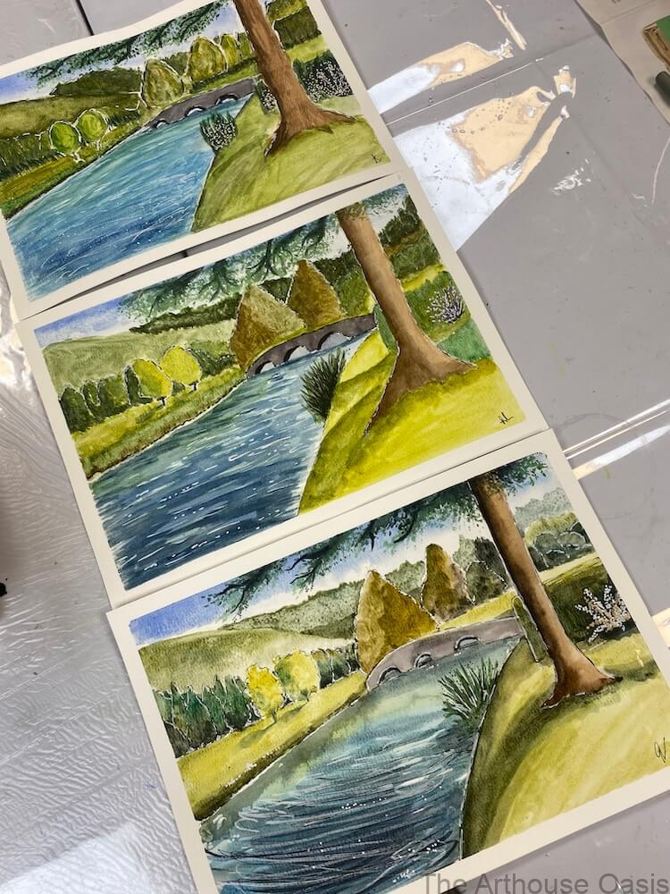 This week’s watercolour session focused on painting peaceful riverscapes with bridges, trees, and reflections. Students worked from the same reference photo, learning how to create flowing water, soft foliage, and layered depth using transparent washes and ink linework.